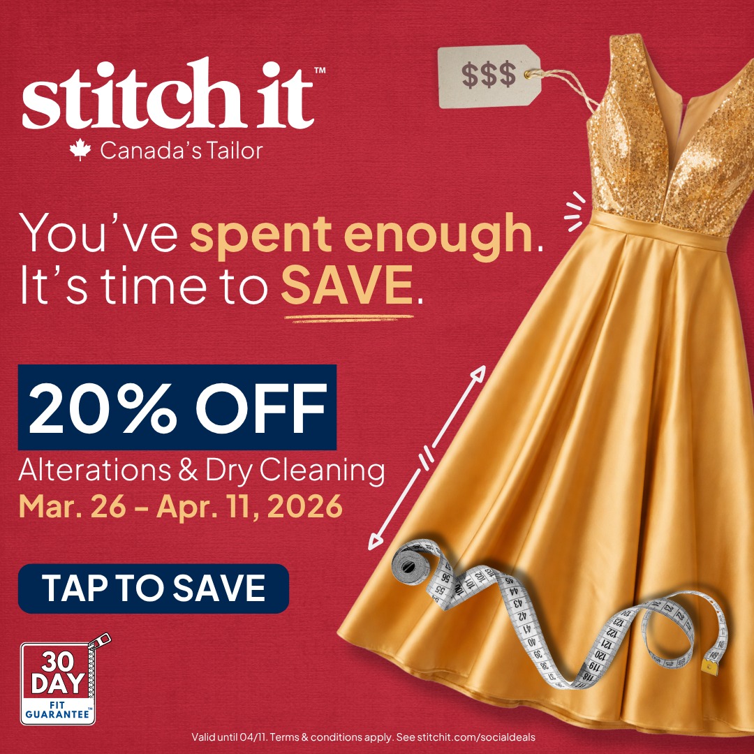 Looking to get the perfect fit for prom? Stitch It has you covered! Save 20% off alterations & dry cleaning from March 26th until April 11th. You've spend enough, it's time to save! Visit us today. Conditions apply. See stitchit.com/deals for details.